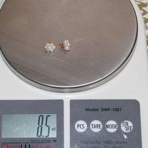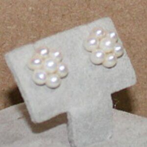 Each earring contains one center natural round white cultured pearl stone approximately measuring 3.85 mm (0.15 in) and six natural round white cultured pearl stones approximately measuring 3.5 mm (0.14 in) each.