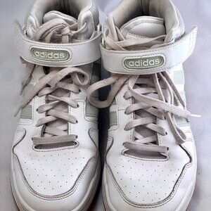 These have a lace closure with velcro top strap, padded color, and cloudfoam super midsole. Stripes and details are a pale green. Super comfy and only gently used. Minimal creasing and no wearing on sole or heels. They are an 8.5 US.