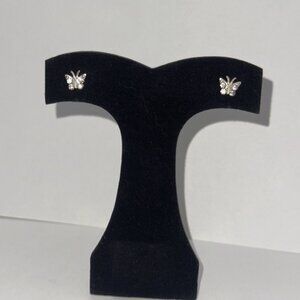 8.52mm Wide Butterfly with 2mm Round Cz in on the wings of the butterfly and sterling silver post earrings. 8.52mm in size come with a silicone stoppers. The center Cz stones are actually 2mm each. These have a total of 4 cz rhinestones that make the shape of a Butterfly. These will be shipped with an anti-tarnish paper in the baggie with the earrings so they don't tarnish as fast.