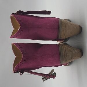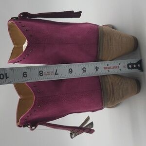 Step out in style with these stunning Dingo ankle boots in a bold fuchsia suede! Featuring a Western-inspired silhouette with studded detailing and a side zipper for easy wear, these boots are perfect for adding a pop of color to any outfit. Crafted with quality suede and a stacked wood-look heel, they’re both fashionable and comfortable. Brand new with tags!