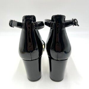 Nine West women's Pruce 3 black patent faux vegan leather heels.