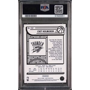 This 2022 Panini Chet Holmgren NBA trading card is an original, licensed rookie card featuring the promising basketball athlete. It has been graded by PSA and rated a 9 MINT, with a fresh slab. The card belongs to set 232 and is part of the 2022 NBA Hoops series.