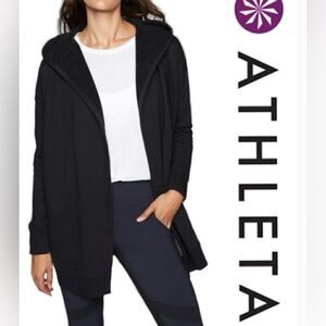 89 ATHLETA PRAJNA HOODED BLACK JERSEY KNIT OPEN WRAP SWEATSHIRT SHIRT TOP