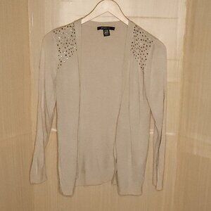 89th & Madison beige thin studded detail open cardigan large. Good condition. Measurements are: .24 ½" sleeve, and 27” from shoulder to hem.