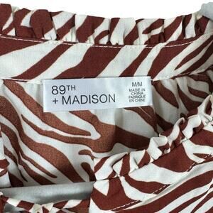 NWT. 89th & Madison Brown & White Zebra Print Long Sleeve Lightweight Blouse. Tie detail at front on front. Buttoned cuff. Recycled polyester material. Approx. measurements: Shoulder to hem 25", pit to pit 23", sleeve from neck to sleeve hem 28". Size M.