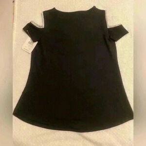 89th + Madison NWT black top with cold shoulders & keyhole opening in front all with silver trim. A very classy top. Women’s size medium. 95 % polyester 5% spandex. Pit to pit 19” length is 25” SFPF HOME