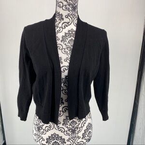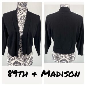 89th & Madison black open front knit sweater. 3/4 sleeve. 72% rayon, 28% polyester. Soft fabric. Size medium.