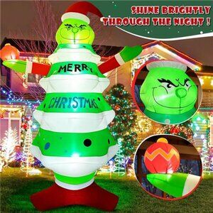 【Unique Design】This Christmas inflatable combines a mischievous green character with a Christmas tree look, wearing a Santa hat and striped outfit. Its big smile and playful pose instantly bring joy and laughter to your holiday yard.