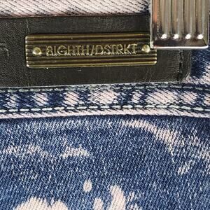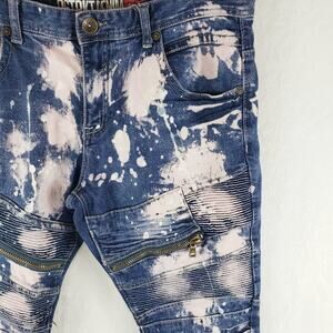 8IGHTH DSTRKT moto zip biker jeans with ribbed topstitch details, faux zipper pockets and pink and white splotch tie dye. Heavy, high-quality denim. Very Unique