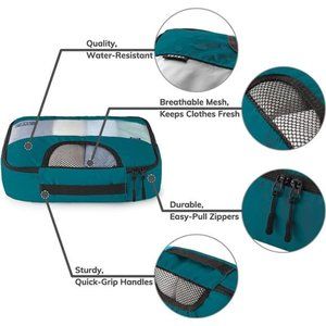 🧿[Innovative & Functional design] – Featuring packing cubes in different sizes (XL for coats, sweaters, and jeans, L for under shirts, dresses, and pants, M for shirts, skirts, shorts, and more, and S for undergarments, socks, or other small garments), with a clear mesh to keep clothes fresh, and a pre-printed label for you to be able to easily tell where everything is, these packing cubes for suitcases can fit in most common suitcases sized 20”, 24”, or 28”.