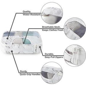 🧿[Innovative & Functional design] – Featuring packing cubes in different sizes (XL for coats, sweaters, and jeans, L for under shirts, dresses, and pants, M for shirts, skirts, shorts, and more, and S for undergarments, socks, or other small garments), with a clear mesh to keep clothes fresh, and a pre-printed label for you to be able to easily tell where everything is, these packing cubes for suitcases can fit in most common suitcases sized 20”, 24”, or 28”.