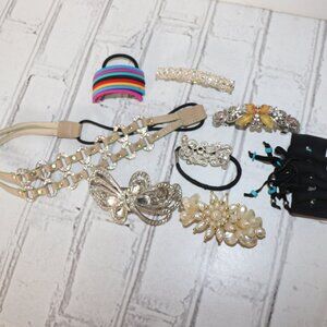 📏 Bundle Includes: • 2 stretchy hair bands – comfy and stylish • 1 headband – adds instant polish • 5 assorted hair clips – from classic to playful • Colors: Black, silver, and mixed tones • Good pre-owned condition