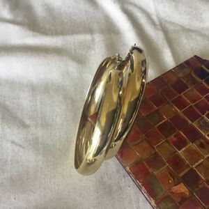 Big and Bold Basic. These goldtone knife edge hoops have a 2 1/2” diameter (length, width) and are very gently used as shown in photos, front and back (which look the same). A wardrobe basic.