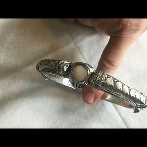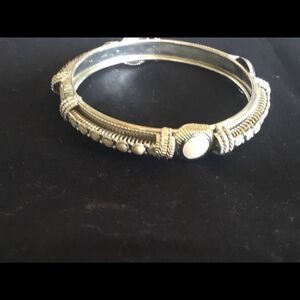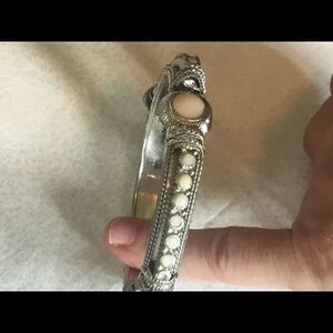 This is a very gently used bangle as shown in the photos. It has a 3” inside diameter and a 3 1/2” outside diameter. Probably for an 8” wearer. Silvertone with cream “stones” around the whole bracelet.