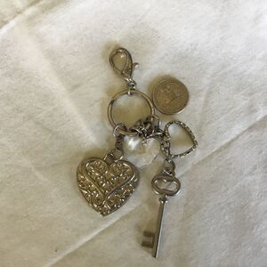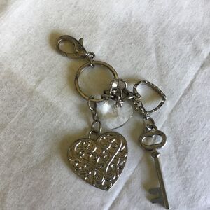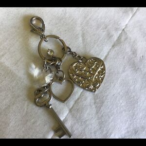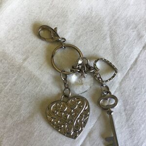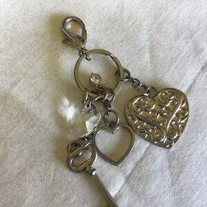Featuring a key, a large engraved heart, a cz decorated open heart and a faceted see-through heart , this charming key ring has an overall length of 5 3/4”. Silvertone and in very gently used as shown in photos. Could also be used a a purse tassel with its large lobster claw clasp to hook onto a purse.