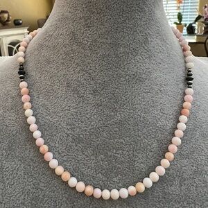 This 8mm Queen Conch Pearl/Bead Necklace features sterling silver oxidized 8mm Saucer Desert Navajo pearls and smaller graduated pearls. The Queen Pink Conch Shell is the main stone, showcasing a Navajo ethnic and regional style. Handmade in New Mexico, this beaded necklace has a Southwestern, Bohemian, and Native American theme. The necklace is 18 inches in length and has a tribal affiliation with the Navajo, making it a beautiful and unique piece of jewelry that reflects the beauty of the beach and the Native American culture.