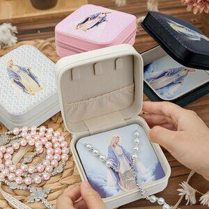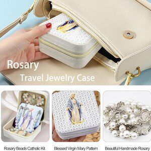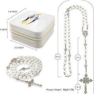Catholic Gift: Elegant 8mm glass pearl rosary necklace, featuring a delicate beaded chain and a meaningful design. It comes in a gorgeous metal gift box with a Virgin Mary print — perfect for gifting or keeping as a personal talisman.