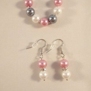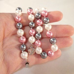 Beautiful women's classic design AAA+ quality natural south sea shell pearls necklace + earrings w/a satin bright reflected light luster, in pink, gray silver and white. Hand knotted double silk thread between each pearl. Brand new, never been worn.