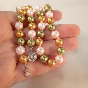 Beautiful women's classic design AAA+ quality natural south sea shell pearls necklace + earrings w/a satin bright reflected light luster, in yellow golden, pink + green . Hand knotted double silk thread between each pearl. Brand new, never been worn.