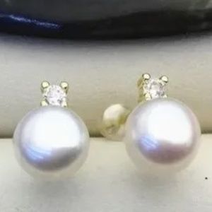 8mm White Cultured Pearl Stud Earrings - 14K Yellow Gold Plate - CZ Accents