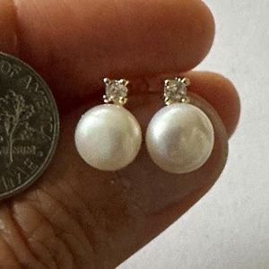 These earrings were made with 8mm white cultured pearls that have not been treated in any way, and have a small cubic zirconia (CZ) accent gem on top :).