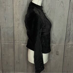 This jacket is like new with minimal signs of wear. The body is 56% cotton, 46% rayon and 2% spandex. The lining is 100% polyester. It does contain a dye which may discolor materials. It is suggested to was with lime colors or separately. It has some lace up designs on the arms and sides of the jacket and two zip pockets on the front. It is a black color. Great jacket for the upcoming fall and winter months but a great jacket for that bike ride as well.
