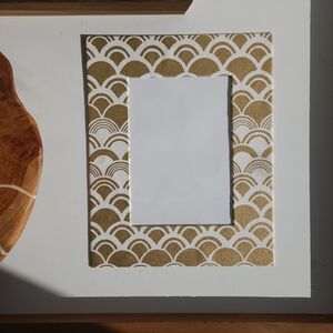 Inspired by the rhythmic flow of the ocean, this handcrafted 8x10 photo mat features a striking gold and white wave pattern, rooted in the traditional Japanese Seigaiha motif—a symbol of strength, resilience, and tranquility. Wrapped in high-end metallic with gold foil scrapbook paper, this piece isn't just a mat—it's an artistic upgrade for your favorite photos or artwork.