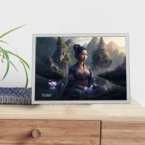 Woman Meditating Gorgeous Landscape Watercolor Fantasy Art Oil Painting Printt