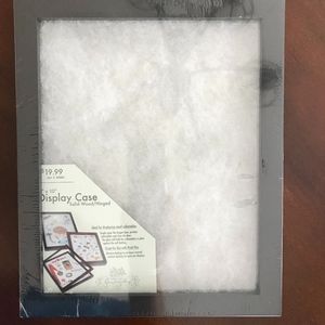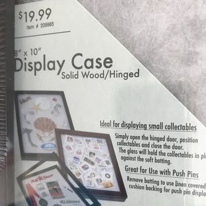 New still in packaging. ** 8 x 10 Wood and Glass Display Case with hinges and locking door. Ideal for displaying small collectibles. Hinged door opens so you can position your collection and close the door. Glass door holds them in place against the soft batting. Or, remove the batting and use linen covered cushion for push pin displays. Can be displayed on a table or hung on a wall. Overall item measures 9 x 11. Actual display, glass opening is 8 x 10.