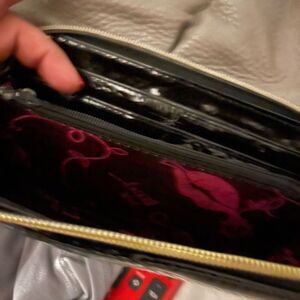 Black leather border & goldtone hardware, nameplate zipper pull ect.