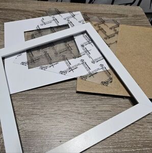 White frame is new just out of package to showcase item. Has hook on back that can be hung as well. Includes a mat for 5x5 viewing