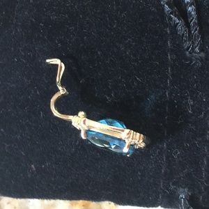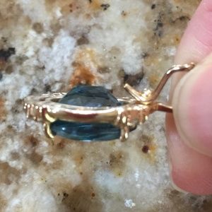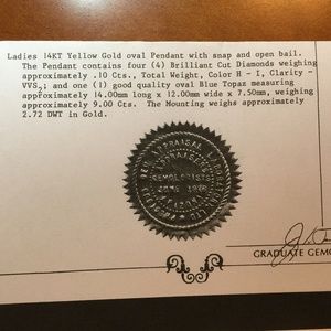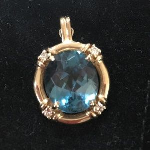 This is a beautiful vintage pendant that's made to easily clip onto a pearl or other beaded necklace. It's made of solid 14k yellow gold with a large 9 carat oval-shaped blue topaz in the center, surrounded by 4 small round diamonds weighing approx. .10 Cts. The mounting weighs approx. 2.72 DWT in gold. I haven't seen many of these in my lifetime. It really does turn a plain necklace into a more much dramatic one.