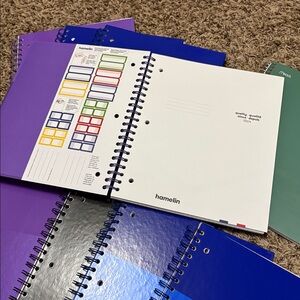 8 1/2 x 11” pages. All pages are perforated for easy tear out. 8 are Hamelin hardcover spiral bound (150 pages), one is a Mead Five Star softcover spiral bound (100 pages), all have inner pockets, all new. The Hamelin ones have sticker tabs too. Sold all together. No stains, damage, odors.