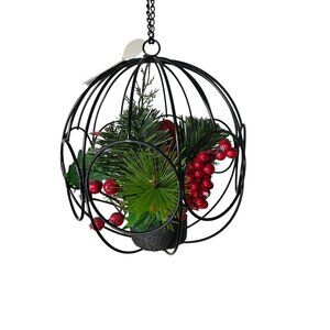 A festive addition to seasonal decor, this 9-inch hanging ball features a black metal cage and artificial pine with berries for a classic holiday look.