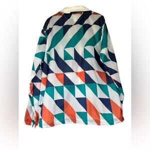 •Features a full-zip front, mesh-lined interior, and vibrant colorblock pattern with red, teal, navy, and white triangles.