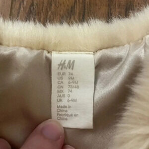 LIKE NEW USED CONDITION. Keep your little girl warm and stylish with this 9-month-old H&M faux fur vest. The vest is perfect for the winter and fall seasons, with its neutral color - making it versatile. The vest has satin lining and a button closure, making it suitable and cozy for your little one's age. It is a great addition to your baby's wardrobe, and perfect for any occasion. Get your hands on this vest today and give your little girl the warmth and fashion she deserves. No stains or holes.