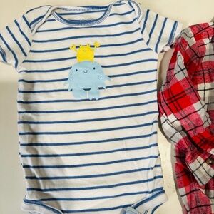 Adorable baby clothing set. Includes a red plaid onesie, striped onesie with cute print, and tie-dye pants. Perfect for any occasion.