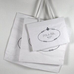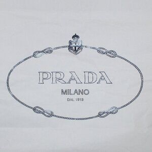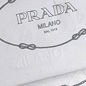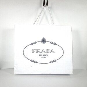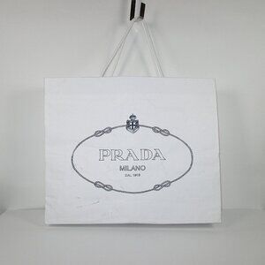 Large embossed white PRADA shopping bag: 18.5"h x 22"w x 5.75"d.
