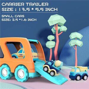 🧿No batteries required, energy saving and environmental protection. All you need to do is just pull the car back and it will move forward. Easy for toddlers to operate. Carrier trailer size : 13.5 * 5.5 inch, small cars size: 2.5 *1.6 inch.