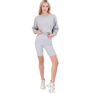 Sweat in style in this 2 piece cropped sweater and bike shorts activewear set by 90 Degrees by Reflex. Top: 60% Cotton/40% Polyester; Shorts: 83% Polyester/17% Spandex. This set features a cropped crewneck sweatshirt and high waisted bike shorts. These pieces can be mixed and matched with all your favorite leggings, tees, and more. The side pocket allows you to store your media while hitting the gym or going for a run. Slouchy sleeves.