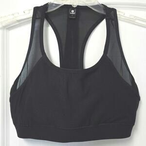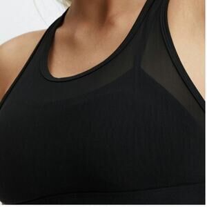 Chic black sports bra with mesh panel. Offers excellent support. Ideal for workouts.