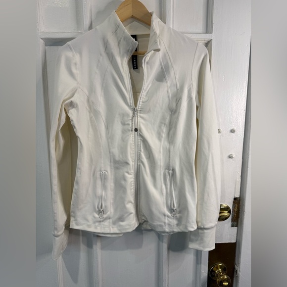 Chic cream utility jacket with zip closure. Features sleek design and practical pockets. Ideal for layering.