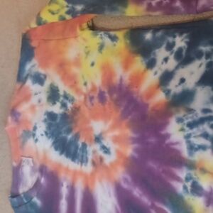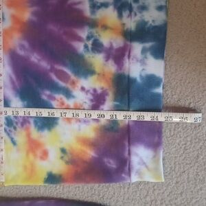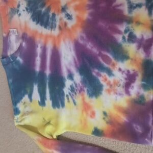 XL 90 Degree by Reflex long sleeve crewneck sweatshirt. personally tie dyed. spiral design with blue, purple, orange, and yellow. 60% cotton, 40% polyester. inside of the sweatshirt is very soft. sweatshirt was like-new before the dye. only washed once after the dye, never worn since.