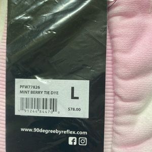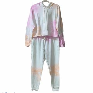 90 Degrees by Reflex Brushed Knit Cropped Hoodie and Jogger, NWT, Size Large, Color-Mint Berry Tie Dye. Hooded sweatshirt; Drop shoulders add a comfortable style to this classic knit hoodie with slightly cropped fit. Attached hood with drawstring, long drop shoulder sleeves, banded cuffs and hem. Joggers; elastic waist,banded hem,60% cotton, 40% polyester. Approx measurements laying flat; Sweatshirt- chest armpit to armpit 25”, sleeve inseam 19”, length 20”. Sweatpants; inseam 31”, rise 11 1/2.