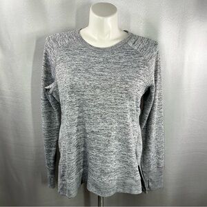FEATURES: Women's gray pullover sweatshirt, crewneck, long sleeve with thumb holes. Side slits with slight high-low effect.