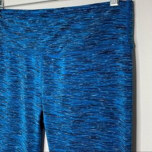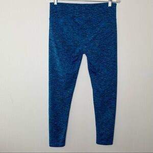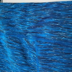 90 Degree by Reflex blue leggings. Blue fabric with grey, black and white spacedye flecks throughout. Hidden pocket in waistband. These leggings were perfect during my first and second trimester of pregnancy. Please note, these are *not* maternity leggings, I just wore them during my last pregnancy. Great stretch without feeling too tight all over. I have the same leggings in grey and pink as well!