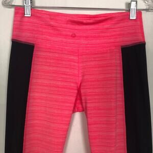 90 Degree athleisure capri leggings in black and neon pink. Mid-rise. Inner front pocket. Gently used. No visible flaws. No pilling. Polyester spandex blend.
