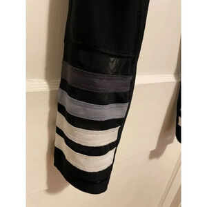 Athletic wear leggings, capri length, has mesh ombre gray black white coloring on the bottom