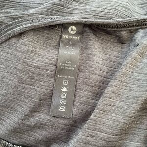 90 Degree by Reflex gray/ black heathered look workout top, size L. Polyester spandex blend, scoop neck, tonal striped. Short sleeved, longer in back. Approximate measurements are pit to pit flat 28”, length from shoulder approximately 25-27”.