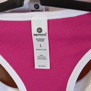 This is a 2-Pack of 90 Degrees by Reflex Rib Seamless Hailee Sports Bras in size L. They are in very berry and white colors with a pullover closure, wireless design, and removable pads. Made of nylon and spandex blend fabric, these sports bras are suitable for activewear and feature the brand logo accent. Perfect for any performance or activity, this sports bra is a stylish and comfortable choice for women.